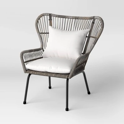 Refresh your patio seating with the 2-Pack of Latigo Patio Club Chairs from Threshold™. Made from gray wicker with a black steel frame, these elegant club chairs come with loose cushions and pillows for extra comfort. Rust and weather resistant for lasting outdoor use, they make a stylish pairing with a variety of outdoor tables and loveseats.