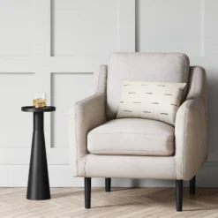 Glam up your living space with the Alester Round Smooth Metal Drink Table from Threshold™. Made from metal, this decorative end table features a conical shape with a round tabletop that can be used as a platform to hold your drink or to display various decor items such as a small lamp, potted succulent, souvenir or framed photograph. Brimming with contemporary flair, this metal accent table features a sleek design with a black finish that rounds off your living room decor in style, while the compact construction makes it a great option for smaller spaces.