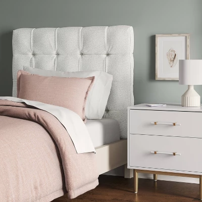 Add a clean and classic touch to your dorm room setup with this Ryan Twin Tufted Stick-On-The-Wall Dorm Headboard from Threshold™. Designed with a contemporary tufted upholstered finish, this twin bed headboard features a sturdy hardwood frame and mounts to any wall using included adhesive backing strips. No assembly is required; tie your whole room together in minutes.